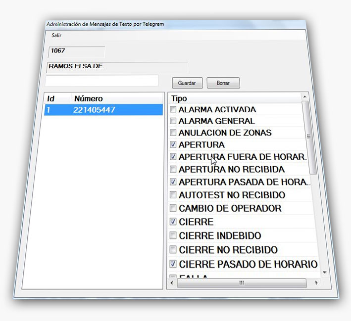 Permite registrar los números de teléfono celular a los cuales el sistema enviará mensajes de texto a través del sistema de mensajería de Telegram: